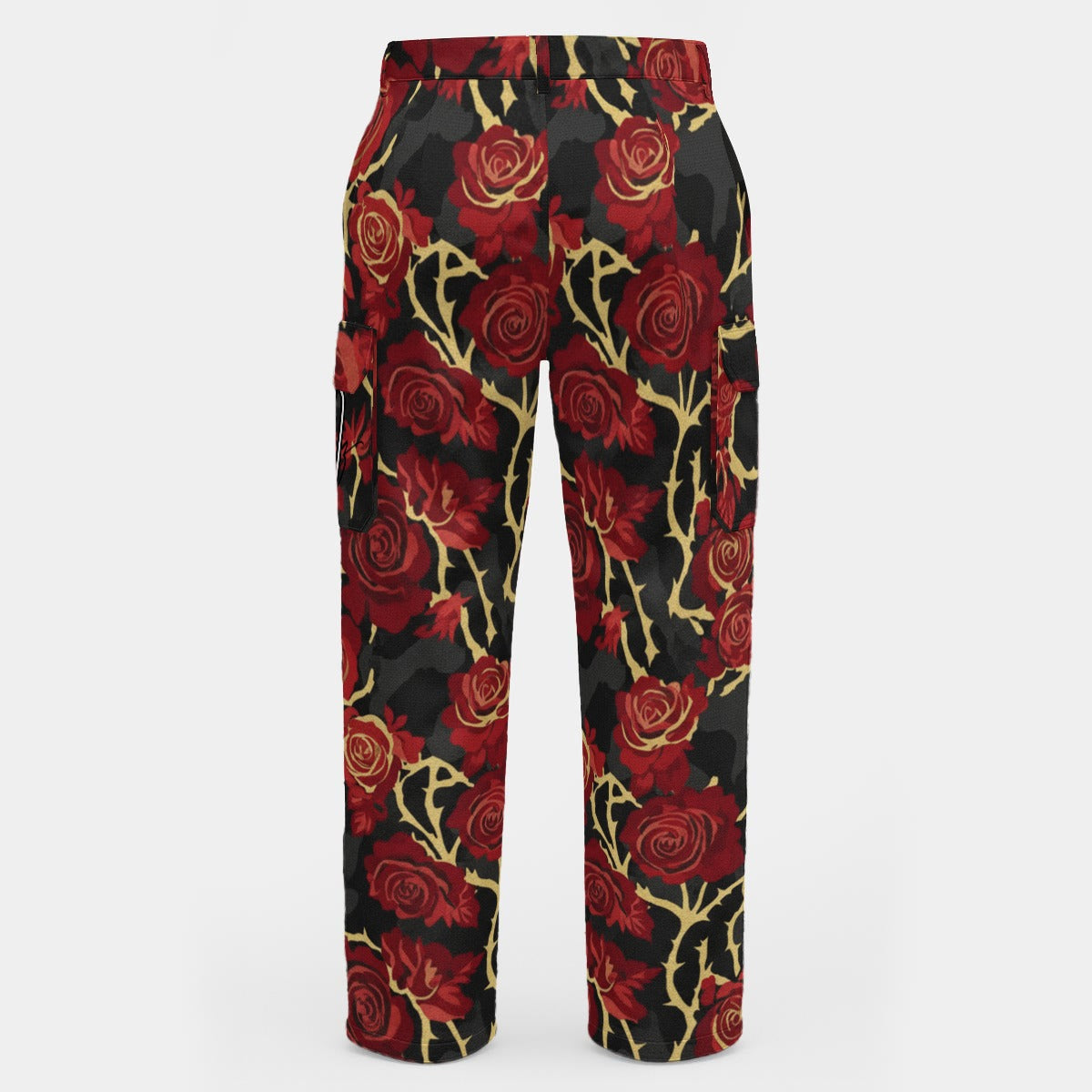 Designed to complete the silhouette of our most intricate drop, the Briar-Patch Utility Trousers are the definitive anchor for the Syndicate’s formal-street hybrid aesthetic. Featuring the same lethal entanglement of blood-red roses and golden thorns, these cargos ensure that your visual impact is consistent from head to toe. This is bespoke armor for the beautifully corrupted.